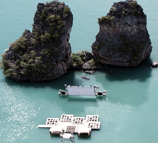 建築家のOle Scheeren氏によってデザインされたアンダマン海(タイ)のプライベートビーチに浮かぶ海上映画館。
