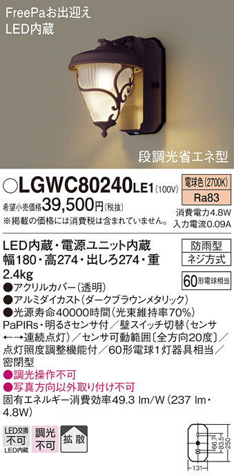 Panasonic エクステリアライト LGWC80240LE1 | 商品情報 | LED照明器具・照明機器の激安通信販売・格安通販・業務用販売・見積もり販売 照明倉庫 -LIGHTING DEPOT-