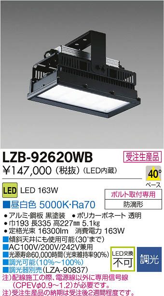 ■傾斜天井にも使用可能(30°まで)|■AC100V/200V/242V兼用|■光源寿命60,000時間(光束維持率90%)|■調光可能(10%〜100%)|■調光器別売(LZA-90837)|注)配線施工の際、電源線以外に専用信号線(CPEVφ0.9〜1.2)が必要です。|注)受注生産品の納期は受注後2週間程度です。|定格光束 16300lm 消費電力 163W|Ra70