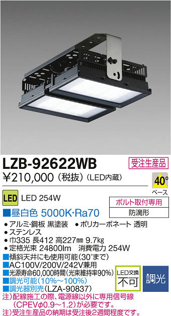 ■傾斜天井にも使用可能(30°まで)|■AC100V/200V/242V兼用|■光源寿命60,000時間(光束維持率90%)|■調光可能(10%〜100%)|■調光器別売(LZA-90837)|注)配線施工の際、電源線以外に専用信号線(CPEVφ0.9〜1.2)が必要です。|注)受注生産品の納期は受注後2週間程度です。|定格光束 24800lm 消費電力 254W|Ra70
