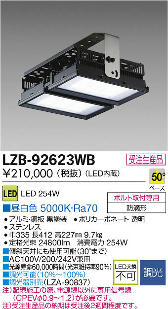 ■傾斜天井にも使用可能(30°まで)|■AC100V/200/242V兼用|■光源寿命60,000時間(光束維持率90%)|■調光可能(10%〜100%)|■調光器別売(LZA-90837)|注)配線施工の際、電源線以外に専用信号線(CPEVφ0.9〜1.2)が必要です。|注)受注生産品の納期は受注後2週間程度です。|定格光束 24800lm 消費電力 254W|Ra70