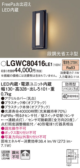 Panasonic エクステリアライト LGWC80416LE1 | 商品情報 | LED照明器具・照明機器の激安通信販売・格安通販・業務用販売・見積もり販売 照明倉庫 -LIGHTING DEPOT-
