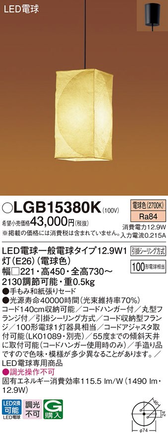 Panasonic ペンダント LGB15380K | 商品情報 | LED照明器具・照明機器の激安通信販売・格安通販・業務用販売・見積もり販売 照明倉庫 -LIGHTING DEPOT-
