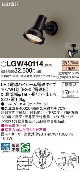 Panasonic エクステリアスポットライト LGW40114 | 商品情報 | LED照明器具・照明機器の激安通信販売・格安通販・業務用販売・見積もり販売 照明倉庫 -LIGHTING DEPOT-
