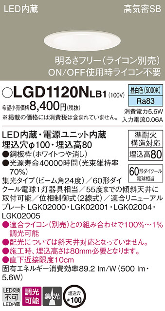 Panasonic ダウンライト LGD1120NLB1