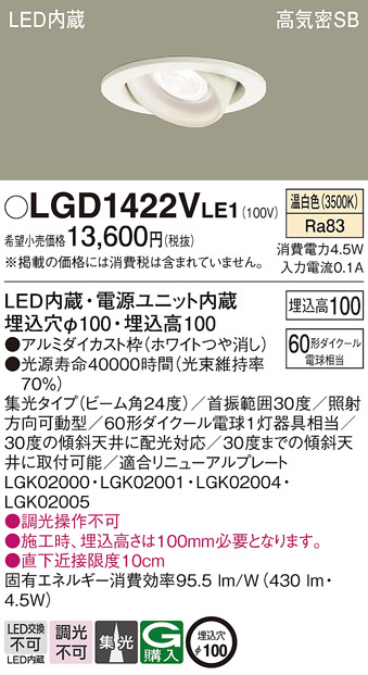 Panasonic ダウンライト LGD1422VLE1 | 商品情報 | LED照明器具・照明機器の激安通信販売・格安通販・業務用販売・見積もり販売 照明倉庫 -LIGHTING DEPOT-
