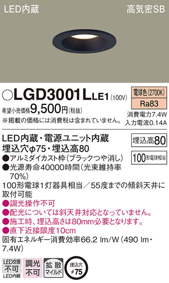 Panasonic ダウンライト LGD3001LLE1 | 商品情報 | LED照明器具・照明機器の激安通信販売・格安通販・業務用販売・見積もり販売 照明倉庫 -LIGHTING DEPOT-