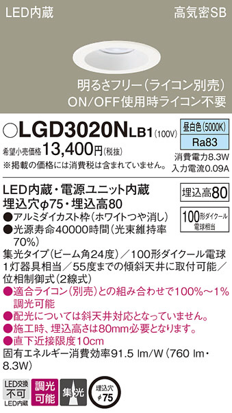 Panasonic ダウンライト LGD3020NLB1 | 商品情報 | LED照明器具・照明機器の激安通信販売・格安通販・業務用販売・見積もり販売 照明倉庫 -LIGHTING DEPOT-