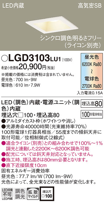 Panasonic ダウンライト LGD3103LU1 | 商品情報 | LED照明器具・照明機器の激安通信販売・格安通販・業務用販売・見積もり販売 照明倉庫 -LIGHTING DEPOT-