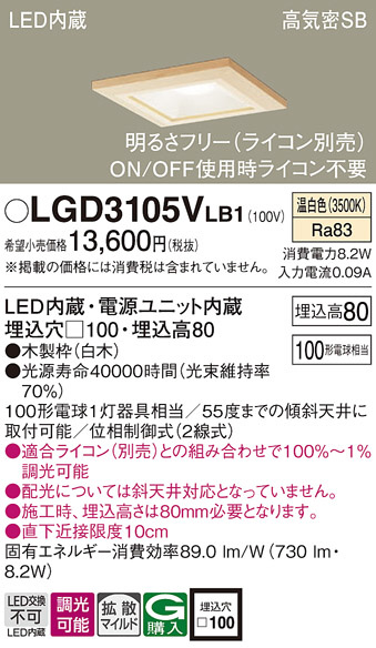 Panasonic ダウンライト LGD3105VLB1 | 商品情報 | LED照明器具・照明機器の激安通信販売・格安通販・業務用販売・見積もり販売 照明倉庫 -LIGHTING DEPOT-