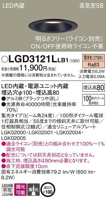 Panasonic ダウンライト LGD3121LLB1 | 商品情報 | LED照明器具・照明機器の激安通信販売・格安通販・業務用販売・見積もり販売 照明倉庫 -LIGHTING DEPOT-