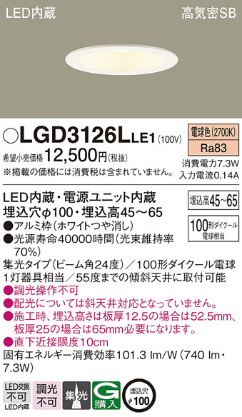 Panasonic ダウンライト LGD3126LLE1 | 商品情報 | LED照明器具・照明機器の激安通信販売・格安通販・業務用販売・見積もり販売 照明倉庫 -LIGHTING DEPOT-
