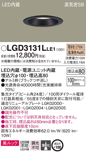 Panasonic ダウンライト LGD3131LLE1 | 商品情報 | LED照明器具・照明機器の激安通信販売・格安通販・業務用販売・見積もり販売 照明倉庫 -LIGHTING DEPOT-