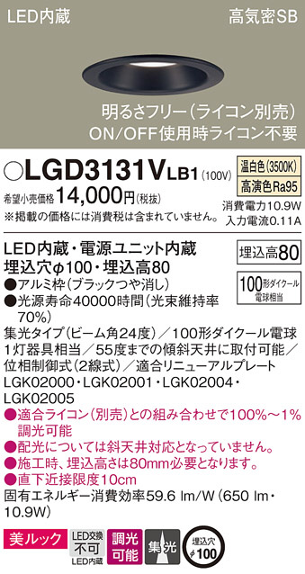 Panasonic ダウンライト LGD3131VLB1 | 商品情報 | LED照明器具・照明機器の激安通信販売・格安通販・業務用販売・見積もり販売 照明倉庫 -LIGHTING DEPOT-
