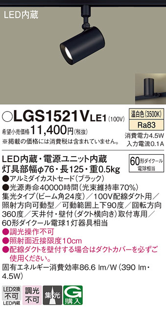 Panasonic スポットライト LGS1521VLE1 | 商品情報 | LED照明器具・照明機器の激安通信販売・格安通販・業務用販売・見積もり販売 照明倉庫 -LIGHTING DEPOT-