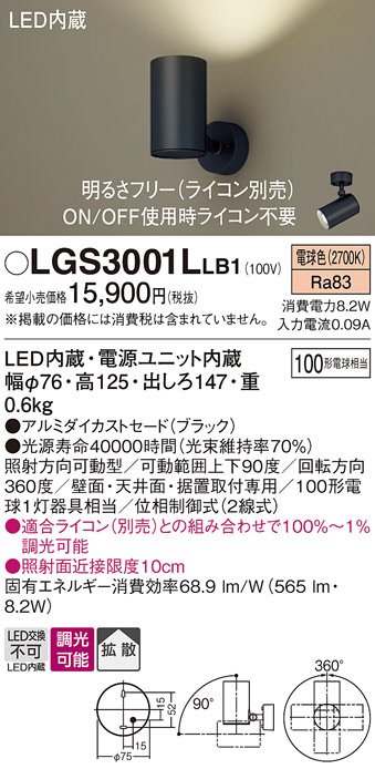 Panasonic スポットライト LGS3001LLB1 | 商品情報 | LED照明器具・照明機器の激安通信販売・格安通販・業務用販売・見積もり販売 照明倉庫 -LIGHTING DEPOT-
