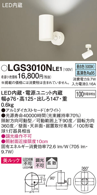 Panasonic スポットライト LGS3010NLE1 | 商品情報 | LED照明器具・照明機器の激安通信販売・格安通販・業務用販売・見積もり販売 照明倉庫 -LIGHTING DEPOT-