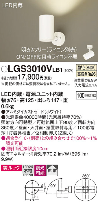 Panasonic スポットライト LGS3010VLB1 | 商品情報 | LED照明器具・照明機器の激安通信販売・格安通販・業務用販売・見積もり販売 照明倉庫 -LIGHTING DEPOT-