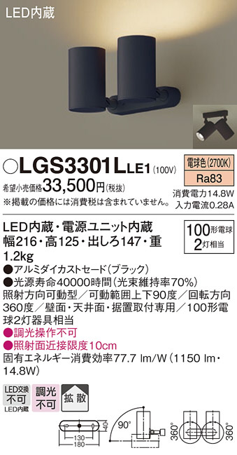 Panasonic スポットライト LGS3301LLE1 | 商品情報 | LED照明器具・照明機器の激安通信販売・格安通販・業務用販売・見積もり販売 照明倉庫 -LIGHTING DEPOT-
