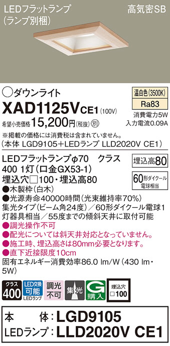 Panasonic ダウンライト XAD1125VCE1 | 商品情報 | LED照明器具・照明機器の激安通信販売・格安通販・業務用販売・見積もり販売 照明倉庫 -LIGHTING DEPOT-