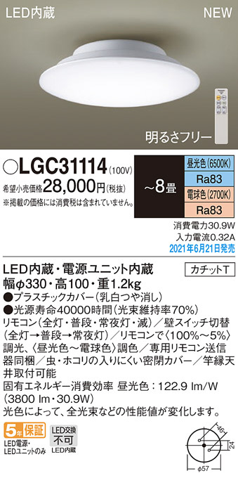 Panasonic シーリングライト LGC31114 | 商品情報 | LED照明器具・照明機器の激安通信販売・格安通販・業務用販売・見積もり販売 照明倉庫 -LIGHTING DEPOT-