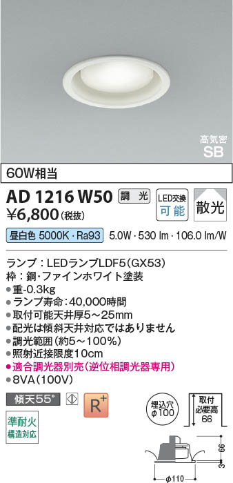 Koizumi コイズミ照明 LED高気密SBダウンライト AD1216W50