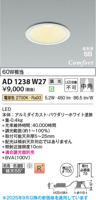 Koizumi コイズミ照明 LED高気密SBダウンライト AD1238W27