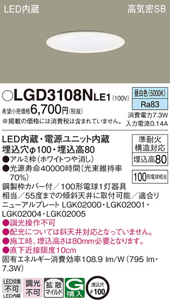 Panasonic ダウンライト LGD3108NLE1 | 商品情報 | LED照明器具・照明機器の激安通信販売・格安通販・業務用販売・見積もり販売 照明倉庫 -LIGHTING DEPOT-