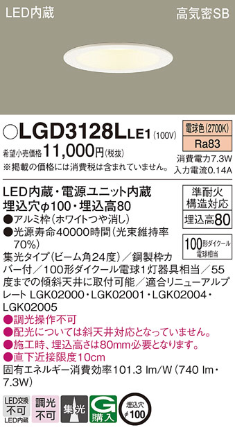 Panasonic ダウンライト LGD3128LLE1 | 商品情報 | LED照明器具・照明機器の激安通信販売・格安通販・業務用販売・見積もり販売 照明倉庫 -LIGHTING DEPOT-
