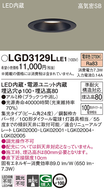 Panasonic ダウンライト LGD3129LLE1 | 商品情報 | LED照明器具・照明機器の激安通信販売・格安通販・業務用販売・見積もり販売 照明倉庫 -LIGHTING DEPOT-