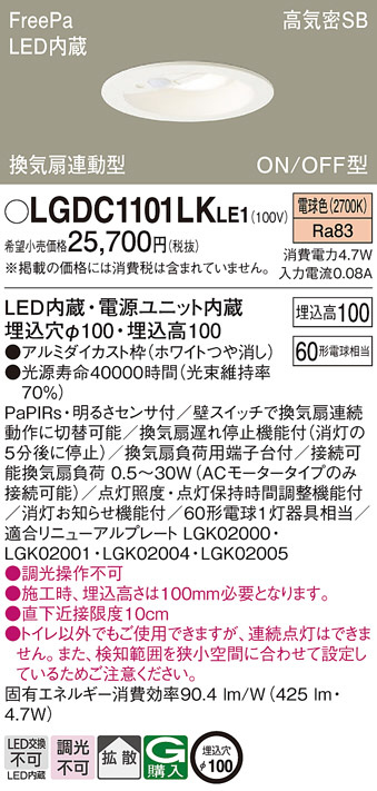 Panasonic ダウンライト LGDC1101LKLE1 | 商品情報 | LED照明器具・照明機器の激安通信販売・格安通販・業務用販売・見積もり販売 照明倉庫 -LIGHTING DEPOT-
