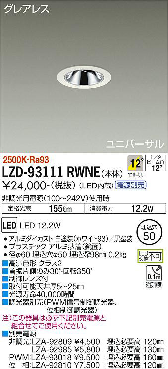 ■別売電源 非調光:LZA-92809 ¥4、500 埋込必要高 120mm LZA-92985 ¥5、800 埋込必要高 130mm PWM:LZA-93018 ¥9、500 埋込必要高 160mm 位相:LZA-92810 ¥7、500 埋込必要高 120m