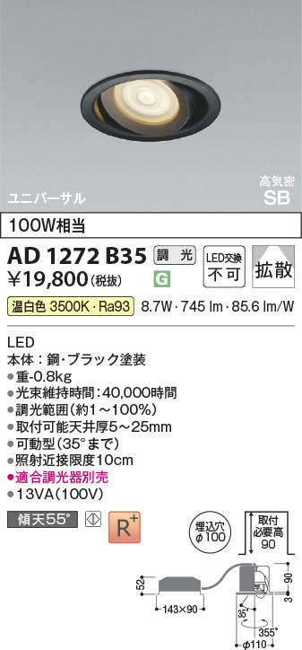 Koizumi コイズミ照明 LED高気密SBユニバーサルダウンライト AD1272B35