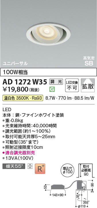 Koizumi コイズミ照明 LED高気密SBユニバーサルダウンライト AD1272W35