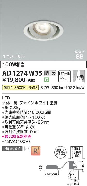 Koizumi コイズミ照明 LED高気密SBユニバーサルダウンライト AD1274W35