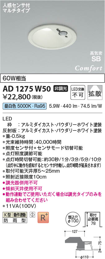 Koizumi コイズミ照明 LED高気密SBダウンライト AD1275W50