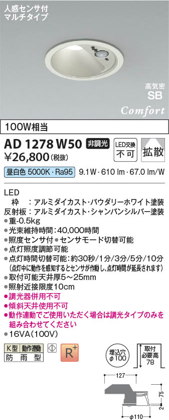 Koizumi コイズミ照明 LED高気密SBダウンライト AD1278W50