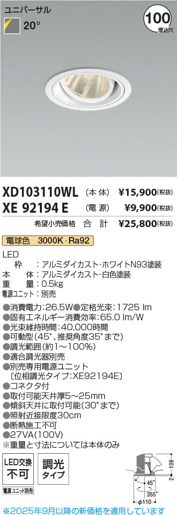 Koizumi コイズミ照明 LEDユニバーサルダウンライト 本体 XD103110WL | 商品情報 | LED照明器具・照明機器の激安通信販売・格安通販・業務用販売・見積もり販売 照明倉庫 -LIGHTING DEPOT-