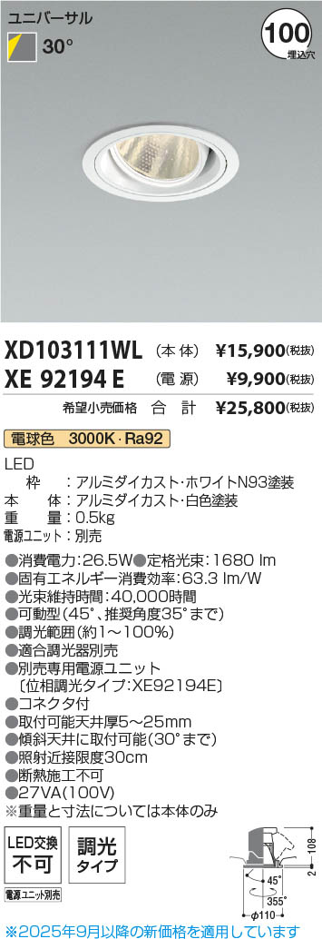 Koizumi コイズミ照明 LEDユニバーサルダウンライト 本体 XD103111WL