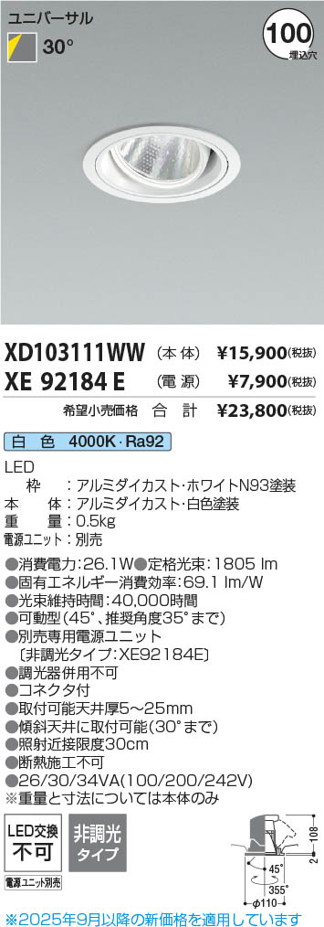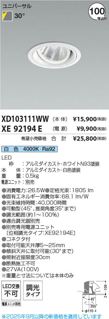 Koizumi コイズミ照明 LEDユニバーサルダウンライト 本体 XD103111WW
