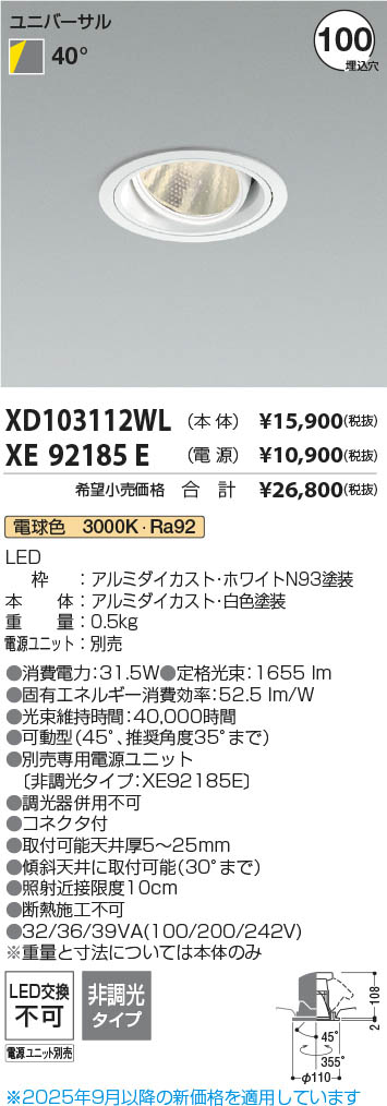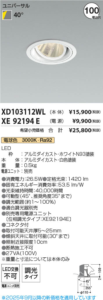 Koizumi コイズミ照明 LEDユニバーサルダウンライト 本体 XD103112WL