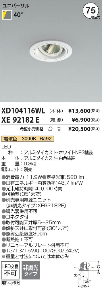 Koizumi コイズミ照明 LEDユニバーサルダウンライト 本体 XD104116WL | 商品情報 | LED照明器具・照明機器の激安通信販売・格安通販・業務用販売・見積もり販売 照明倉庫 -LIGHTING DEPOT-