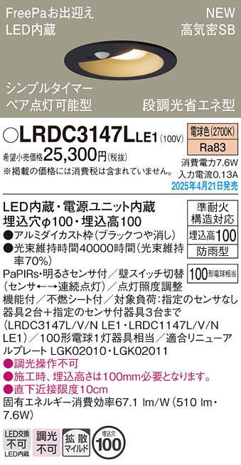 Panasonic エクステリアダウンライト LRDC3147LLE1