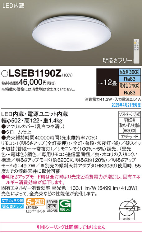Panasonic シーリングライト LSEB1190Z | 商品情報 | LED照明器具・照明機器の激安通信販売・格安通販・業務用販売・見積もり販売 照明倉庫 -LIGHTING DEPOT-
