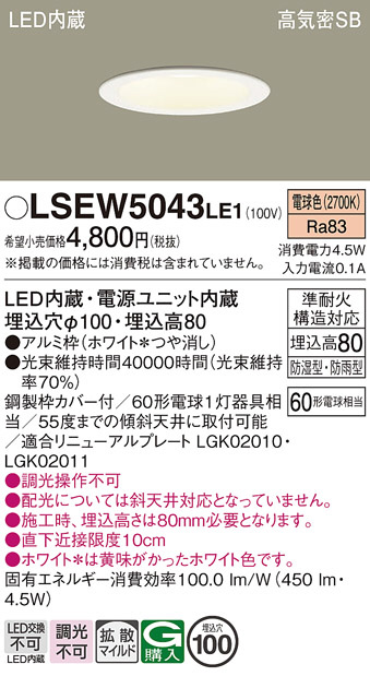 Panasonic エクステリアダウンライト LSEW5043LE1