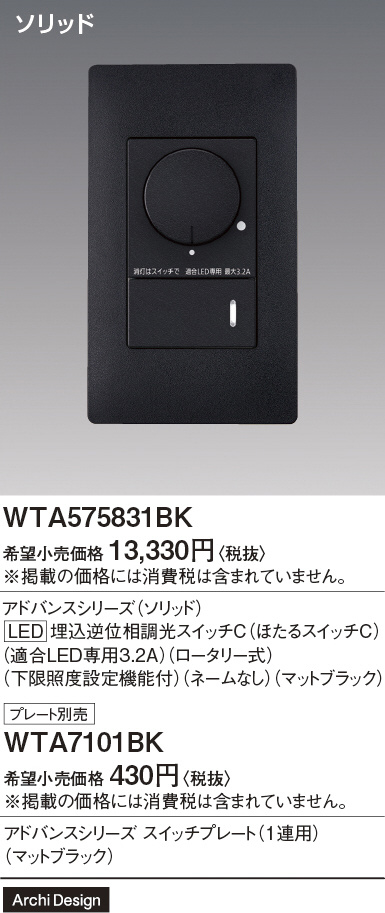 Panasonic アドバンスLED埋込逆位相調光スイッチC 適合LED3.2A・ロータリー・NなしB WTA575831BK