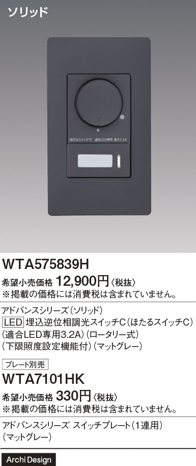 Panasonic アドバンスLED埋込逆位相調光SWC マットグレー適合LED専用3.2A WTA575839H
