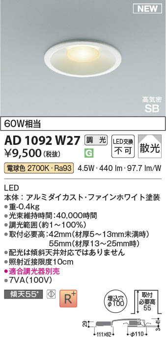 Koizumi コイズミ照明 LED高気密SBダウンライト AD1092W27