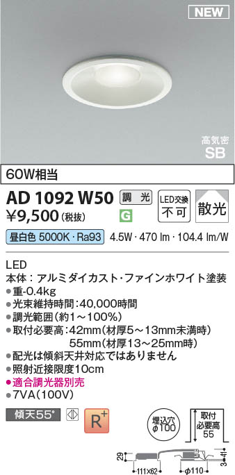 Koizumi コイズミ照明 LED高気密SBダウンライト AD1092W50