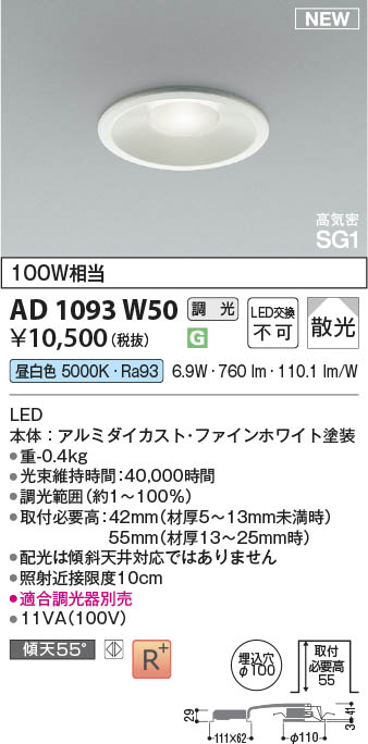 Koizumi コイズミ照明 LED高気密SG1ダウンライト AD1093W50